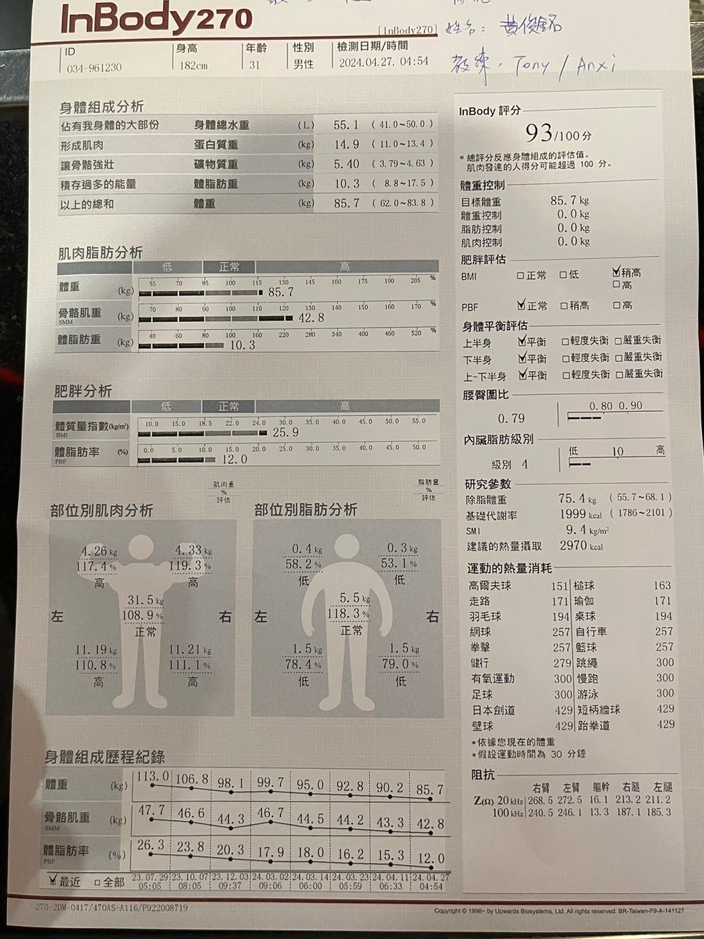 兩年健身房 + 將近一年的飲食控制 115 – 86 = 29 kg -  -  -  -  先說結論 三分練、七分吃 一定要算熱量才會瘦 吃原型食物 + 提高蛋白質比例就可以吃很多 注意不要讓血糖波動太大就不會餓 循序漸進才能夠持之以恆 減肥的動機 疫情關在房間覺得再不動可能會肥到出事,晚上睡覺都會心悸身體很差 搬來台北後就馬上找離家最近的健身房報名 後來大學同學因病過世,再一次體悟到這個年紀已經不是無敵了 重訓 重訓因為以前有底子,所以算是複習為主,最主要還是有個教練約課才不會忙了就斷了運動習慣。後來一方面已經回復記憶能夠自己練,另一方面運動目標以格鬥為主,反而不需要這麼多肌肉,所以就停掉重訓課了。 拳擊 很幸運的遇到了當時也是菜鳥的拳擊教練 Roger,打開了我對格鬥的興趣。拳擊真的是很適合新手的運動,如果不移動只打手靶的話強度可以到非常低,但真的認真起來強度也可以突破天際。 跆拳道 --- 後來換了新的教練 Bolly,體能也有一定基礎可以嘗試以腳為重的跆拳道,這也加劇了足底筋膜炎的發生機率,有時候真的痛到沒辦法正常走路,每隔一段時間都需要教練幫忙筋膜放鬆才行。練了跆拳道後整個人的平衡性變得很好,也比以前更加的敏捷。 HIIT 開始參加減重比賽後遇到新的拳擊教練 Kai 開始狂操體能,每次前半堂真的是操到爆炸,但一個月下來自己覺得體能變得很好,爬捷運出口的長樓梯都可以不喘一口氣。 筋膜 -- 因為格鬥類運動訓練強度很高,所以都要靠筋膜放鬆才能緩解小腿疼痛,真的很感謝 Tony 教練每次都很認真的幫我把小腿筋壓開。按了痛一天,不按開走路痛一個禮拜。沒有筋膜放鬆來加速恢復,真的不知道怎麼面對下次的訓練。 飲食 上面講了這麼多運動,但真正減重的關鍵是嚴格的控制飲食。我第一年運動的時候完全沒在算熱量,所以體重沒有低於 105kg 過。會開始控制飲食,一方面是我媽迷上了 168、211、地中海飲食這類的減重方法,開始給我帶便當,另一方面是練格鬥體重太重耐力很差且移動非常緩慢,所以整體體重需要大幅下降,連過多的肌肉量都要減少才行。 飲食一開始不要一次就全換,心理跟生理壓力都會太大,要循序漸進的換才能夠變成習慣。本身因為痛風關係就不喝含糖飲料,所以只要戒零食跟垃圾食物就簡單很多。一開始只是一餐改吃自己帶的 211 便當,後來早餐不吃發現也可以,漸漸的變成午餐只喝牛奶 + 晚餐吃 211。 假性飢餓 有時候想吃零食就只是無聊想做點事,所以後來全部改成泡茶包跟咖啡,也就完全戒掉零食了。 大量喝水也是非常重要,因為糖跟鹽滲透壓高的關係,都會讓血液中的水分上升,所以多喝水把血液沖淡不水腫,也可以加速食物消化與代謝。 熱量缺口 上面講到要算熱量,畢竟要長期維持某個體重就是要吃進對應的熱量才行,只要熱量減少了,體重自然就會下降,至於是減脂肪還是掉肌肉就要看涉入的營養素組成與運動多寡。 目前發現 Cofit 這個 app 可以幫忙記錄飲食跟算熱量,簡單拍個照加上用份數來估算熱量還算有效,因為自己估計一定會有誤差,我都會抓超過基礎代謝就好,不會真的吃到他所建議的熱量,這樣每個禮拜會瘦 1% 的體重。...