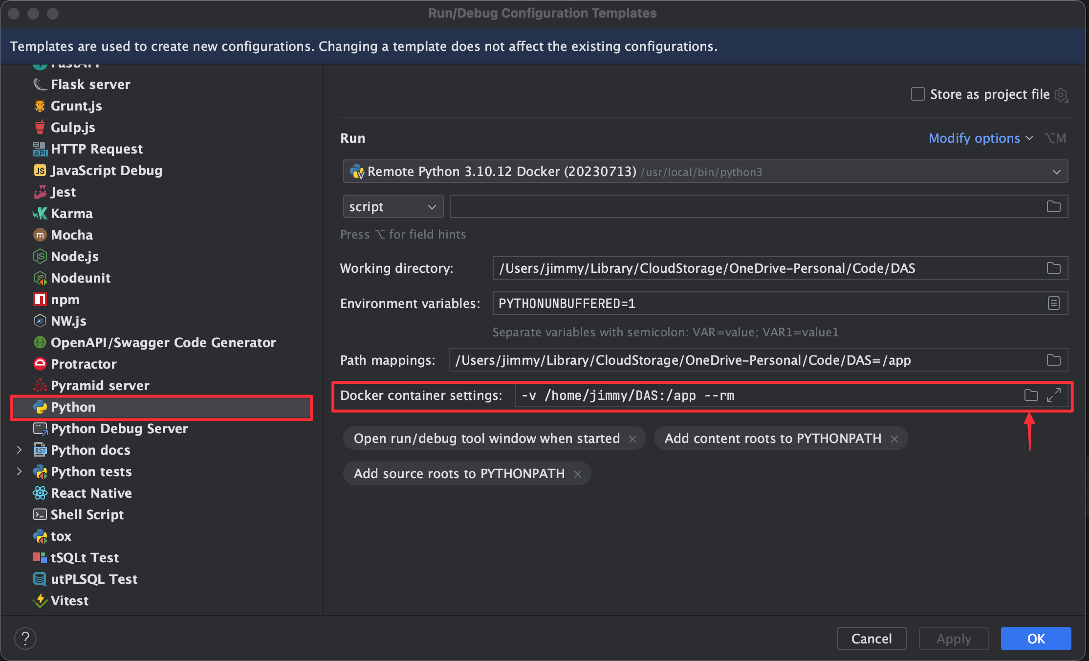 選擇 Python 內的 Docker container settings 中的資料夾圖示