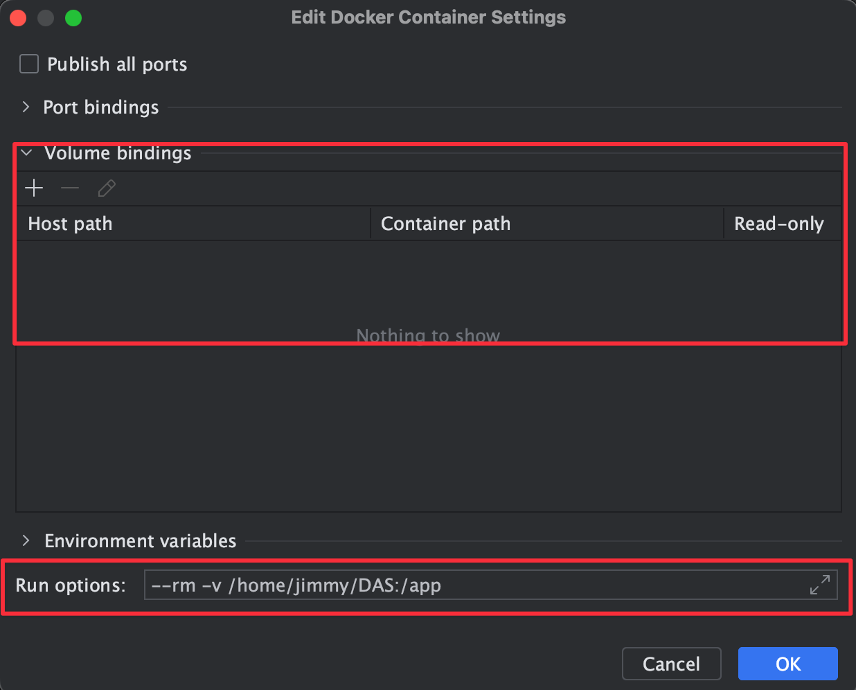 因為原本的 Volume bindings 有 bug 要全部刪掉,改成自己寫 docker run 的指令到 Run options 內: