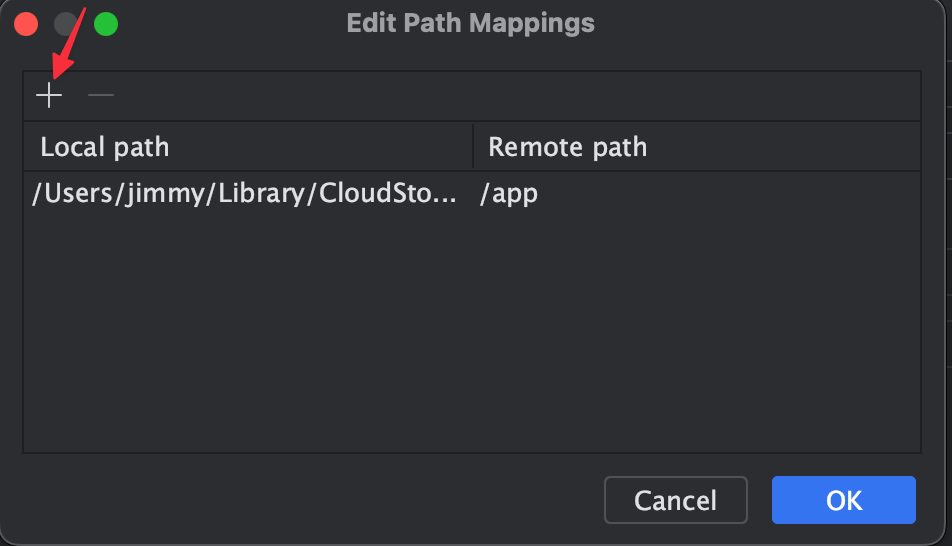 按 + 新增一個路徑映射,Local path 設定成筆電內 Project 的資料夾,Remote path 設定成容器內資料夾。