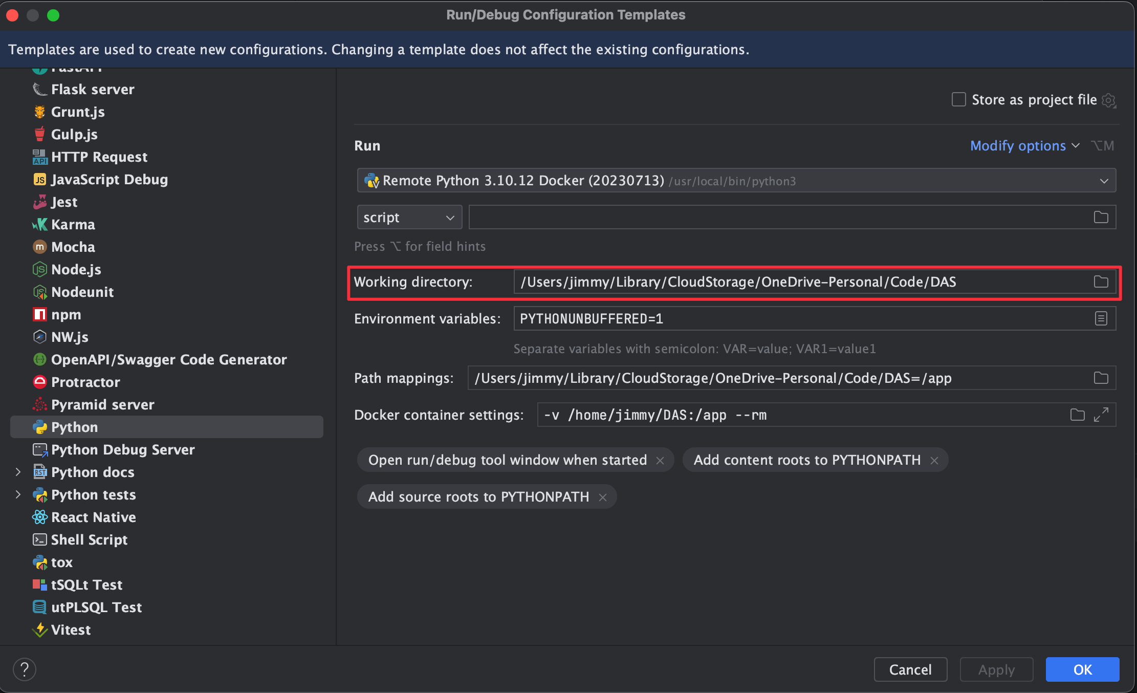 回到剛剛 Edit configuration templates 的 Python 頁面,選取 Path mappings 旁邊的資料夾圖示。