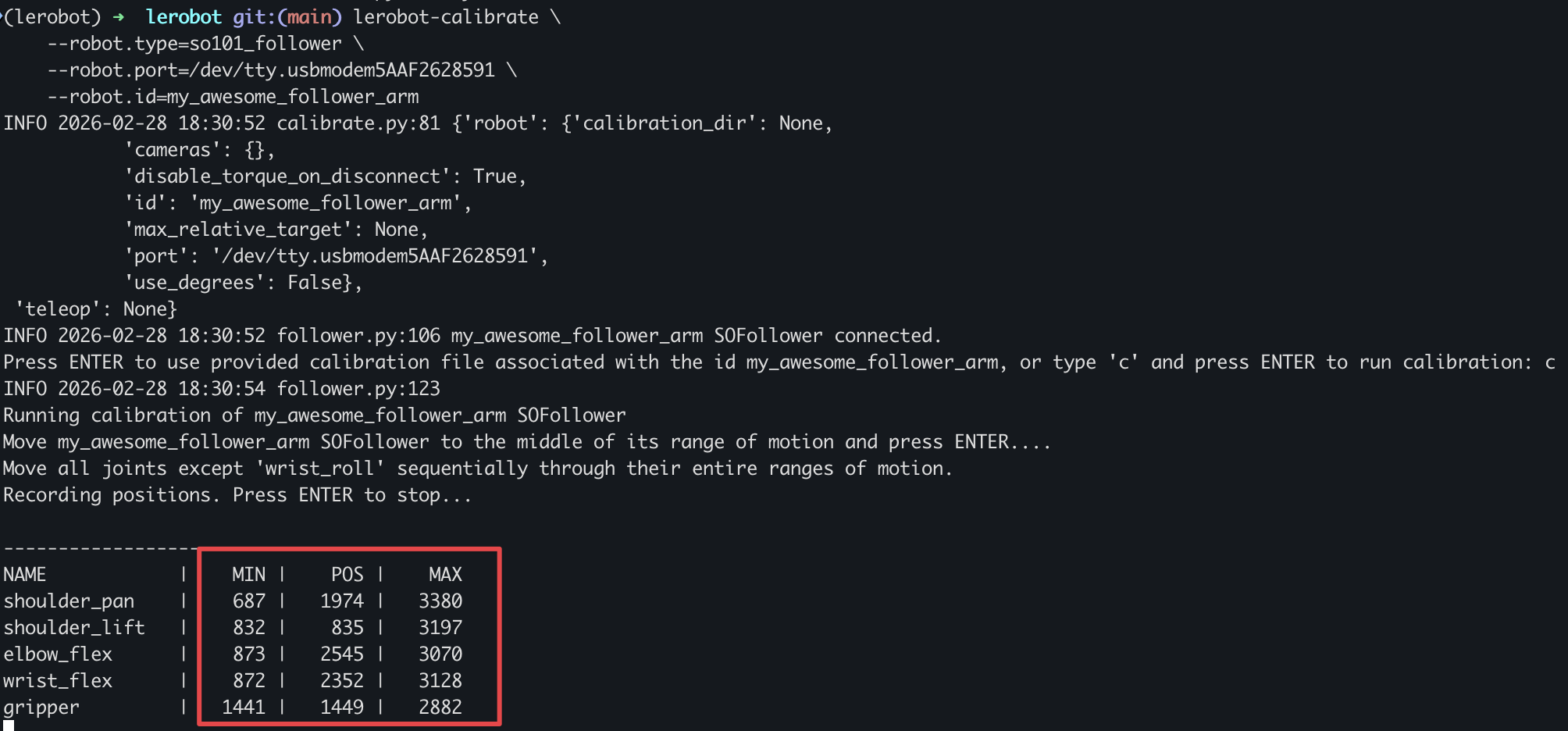 如果是從盒子拿出來第一次校正,先讓手臂在它折疊的姿勢,先隨便按 Enter 跳過,如果一開始不是在折疊的姿勢,伺服轉過頭會報錯。第二次以後如果出現問你要不要用之前的設定檔,按 c 重新校正,然後再移到它說的每個關節中間位置。